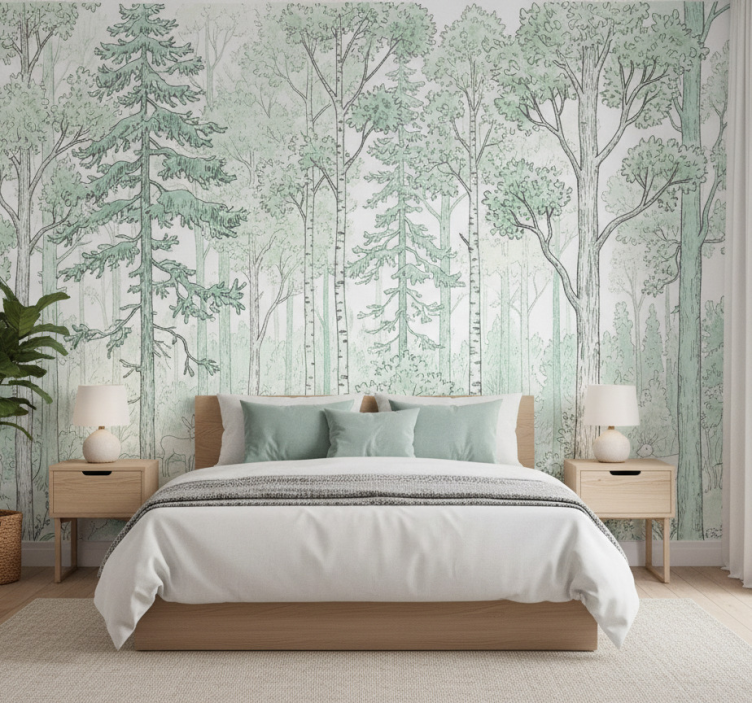 Papier peint forêt croquis de bois menthe