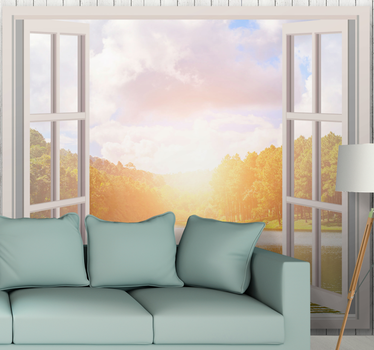 Éveillez vos sens avec notre papier peint nature lever de soleil sur le lac, un véritable chef-d'œuvre qui vous transporte au cœur d'un paysage enchanteur. Imaginez-vous contempler à travers une fenêtre des arbres majestueux se reflétant dans un lac tranquille alors que le lever du soleil colore le ciel de teintes douces et apaisantes. Ce trompe l'oeil sublime crée une illusion d'espace qui invite à la sérénité et à la contemplation.