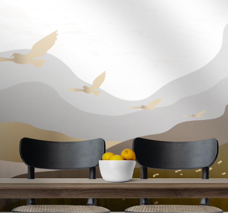 Plongez dans un univers enchanteur avec notre Papier peint nature silhouettes d'oiseaux volants. Ce design captivant met en scène des silhouettes d'oiseaux en plein vol, entourées de majestueuses montagnes et d'une nature luxuriante. Le motif doré ajoute une touche d'élégance et d'originalité, transformant vos murs en véritables œuvres d'art. Chaque illustration raconte une histoire, invitant à l'évasion et à la sérénité.