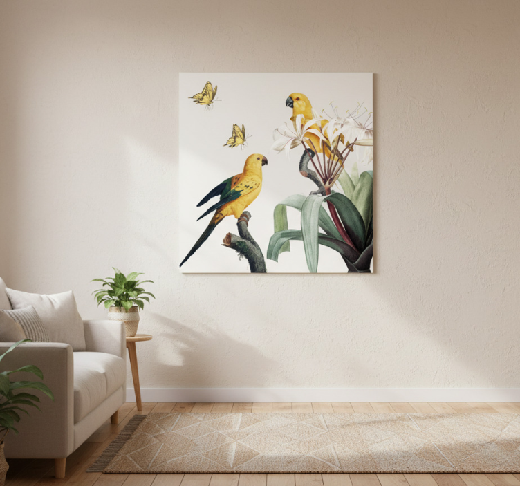 Le Poster salon perroquets avec fleurs jaunes et papillons est parfait pour ceux qui souhaitent ajouter une note joyeuse et vivifiante à leur décoration. Imaginez la beauté de la nature s'inviter chez vous, créant une atmosphère chaleureuse et accueillante. Ce poster devient alors bien plus qu'une simple décoration, il raconte une histoire, celle d'un voyage au cœur des tropiques !