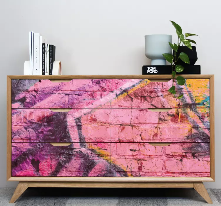 Plongez dans un univers de créativité avec notre Adhésif meuble ambiance colorée et dynamique. Ce produit arbore un motif captivant inspiré des murs de briques, des tags et des graffitis. La texture artistique, colorée et géométrique, avec des teintes de rose, transformera vos meubles en véritables œuvres d'art. Offrez à votre espace une touche de street art qui ne manquera pas d'impressionner vos invités !