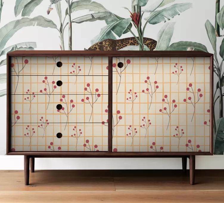 Ajoutez une touche de charme à votre intérieur avec notre Adhésif meuble motif floral coffre. Ce design coloré, à carreaux et agrémenté de baies, évoque un modèle à la fois moderne et intemporel. Que ce soit pour un meuble, un tiroir ou une poitrine, cet adhésif transformera vos espaces en un clin d'œil!