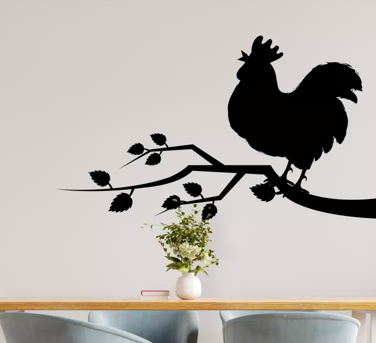 Référence: A49034Une silhouette frappante d'un coq perché sur une branche, harmonisant les éléments de la nature avec la vie à la ferme. La branche ornée de feuilles ajoute une touche organique, renforçant l'ambiance rustique du design, idéale pour apporter un charme rural à n'importe quel espace.