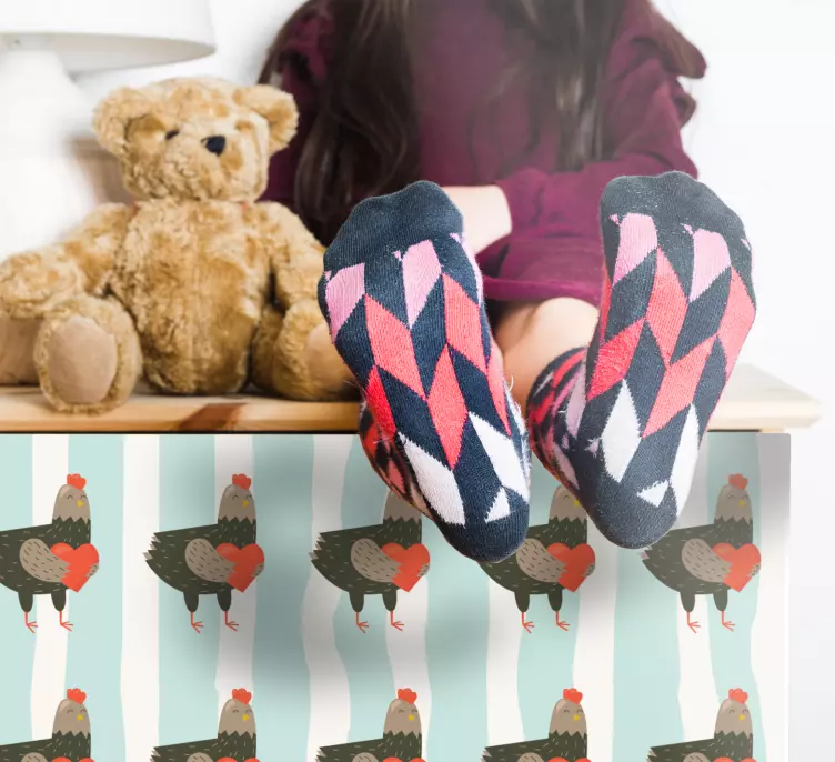 Découvrez notre Sticker animaux de la ferme motif poules charmantes, un véritable régal pour les yeux ! Ce design coloré et mignon met en scène des coqs entourés de cœurs et de rayures, créant une ambiance chaleureuse et accueillante. Parfait pour apporter une touche de vie à vos meubles et à votre décoration intérieure, il saura séduire petits et grands avec ses motifs d'animaux de la ferme.