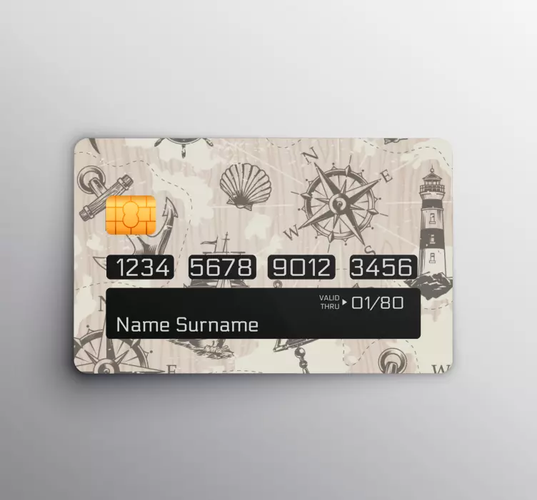 Découvrez notre Sticker carte bancaire thème nautique, une véritable œuvre d'art qui embellit votre carte de crédit ! Avec son design graphique unique, il arbore des illustrations captivantes d'ancres, de phares et de coquilles marines, le tout sur un fond évoquant le bois. Ce modèle nautique vous transporte directement en mer, rendant chaque transaction aussi plaisante qu'une promenade sur la plage.