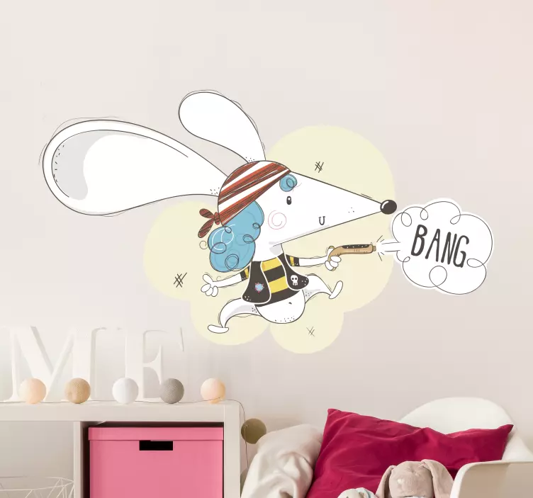 Référence: A47215Une représentation cartoon amusante d'une souris déguisée en pirate, avec un chapeau rayé et des cheveux bleus. Le personnage fantaisiste tient un jouet et s'exclame 'BANG', ajoutant une touche de plaisir et d'aventure, parfait pour les espaces pour enfants.