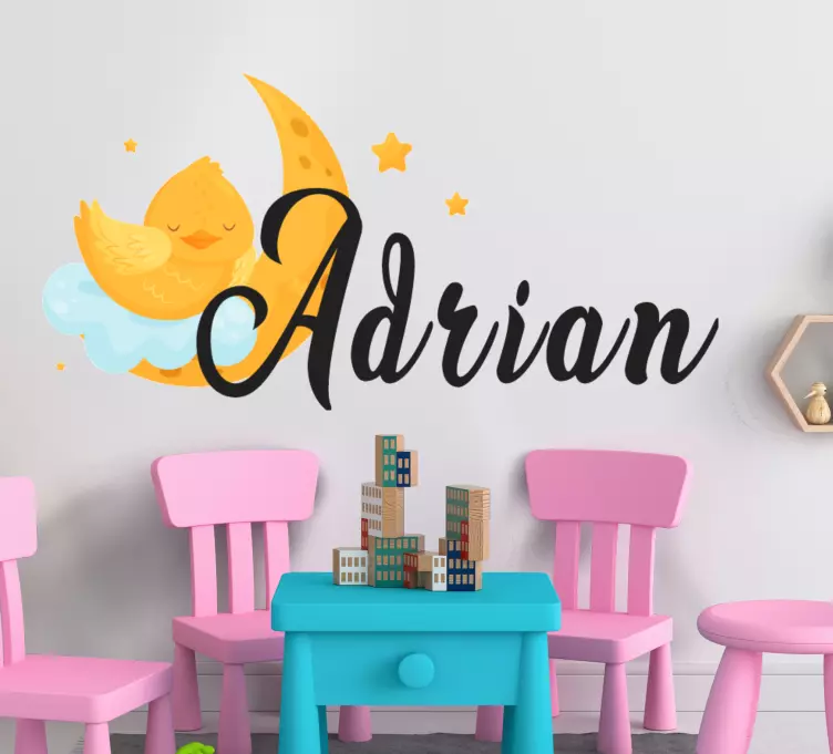 Référence: A48928Une illustration de lune ludique présente un oiseau joyeux reposant sur des nuages, entouré d'étoiles vibrantes. Ce design apporte une touche fantaisiste aux espaces pour enfants, invitant à la joie et à la créativité. Il permet une personnalisation pour renforcer la connexion personnelle, ce qui le rend parfait pour une nursery ou une salle de jeux.