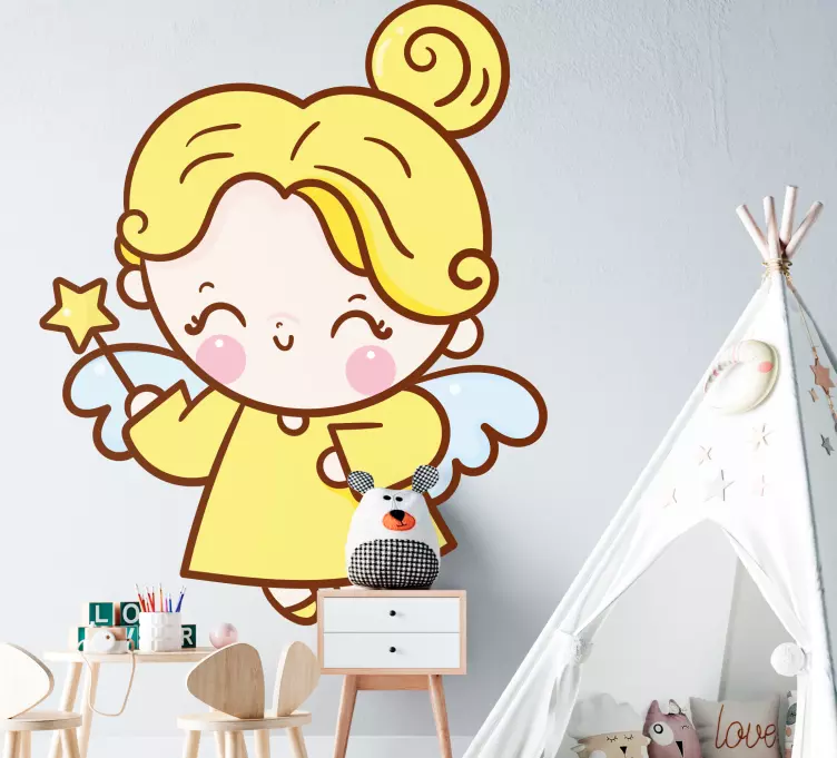 Transformez la chambre de votre enfant avec notre Sticker chambre enfant personnage d'ange mignon ! Ce design espiègle met en avant un personnage d'ange souriant tenant une baguette magique, entouré de couleurs jaunes pétillantes et de motifs de fées. Un ajout charmant et capricieux pour stimuler l'imagination des petits !
