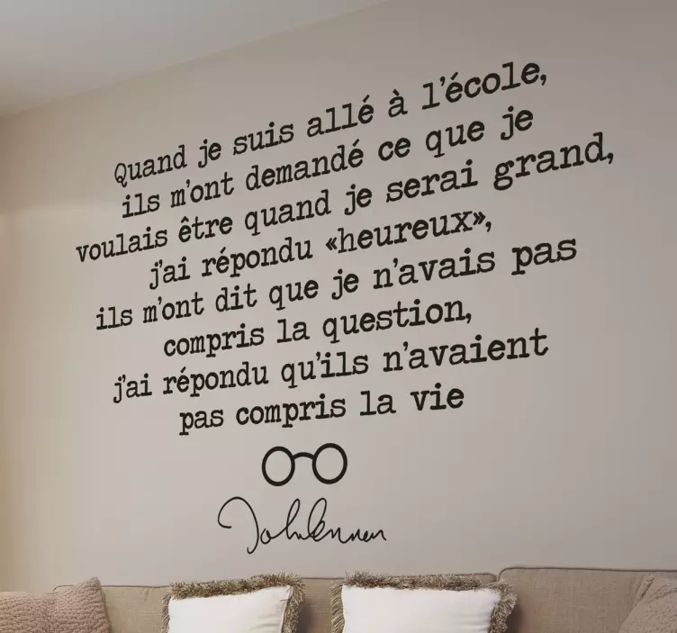 Sticker texte du célèbre chanteur John Lennon : "e; Quand je suis allé à l'école, ils m'ont demandé ce que je voulais être quand je serai grand, j'ai répondu heureux, ils m'ont dit que je n'avais pas compris la question, j'ai répondu qu'ils n'avaient pas compris la vie."e;