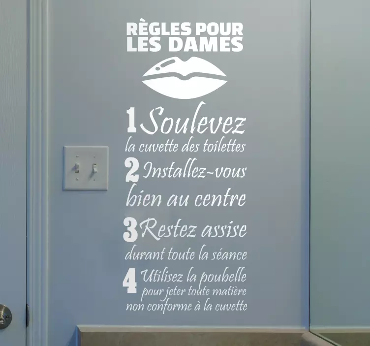 Ce sticker mural original présente quelques règles pour mesdames. Avec un design agréable et amusant, il est parfait pour décorer votre salle de bain ou toute autre pièce de votre maison. Disponible en différentes options de couleurs, choisissez-le dans une taille appropriée parmi l'une des options que nous vous proposons.