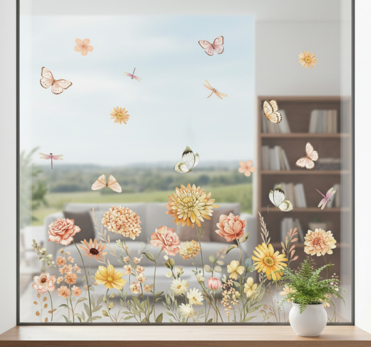 Sticker fenêtre prairie de fleurs sauvages avec papillons