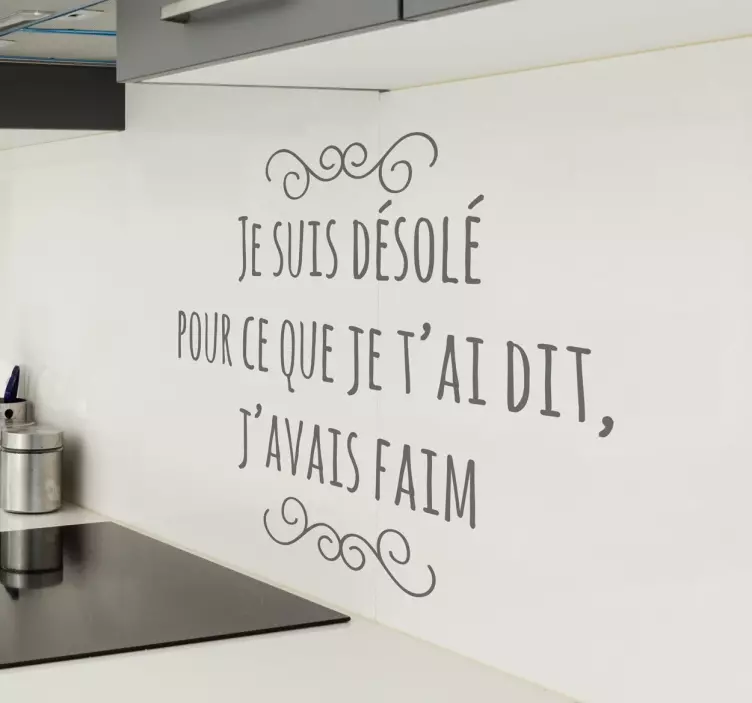 Référence: A8582Vous faites parti de ces personnes qui deviennent irritables et ronchons lorsqu'ils ont faim ? Faites donc savoir à votre entourage que vous êtes désolé pour tous les mots que vous dites et qui dépassent votre pensée lorsque votre ventre crie famine. Vous pourrez appliquer ce sticker amusant aux lignes élégantes dans votre cuisine ou