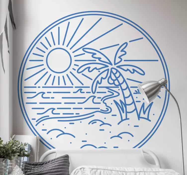 Découvrez notre Sticker monde vue sur la côte tropicale, un design captivant qui évoque une ambiance paradisiaque. Avec son motif représentant un cercle ensoleillé, une plage bordée de palmiers, une mer aux vagues douces et un dessin au trait évoquant la nature tropicale, chaque regard vous plongera dans un paysage de rêve.