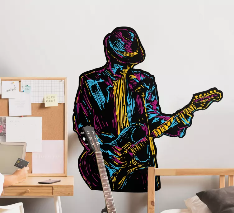 Référence: A48543Une silhouette vibrante représentant un guitariste vêtu d'un costume élégant et d'un chapeau, capturé en pleine performance. La représentation artistique utilise des couleurs vives pour mettre en valeur l'énergie de la musique, ce qui en fait un ajout parfait pour les passionnés de musique.