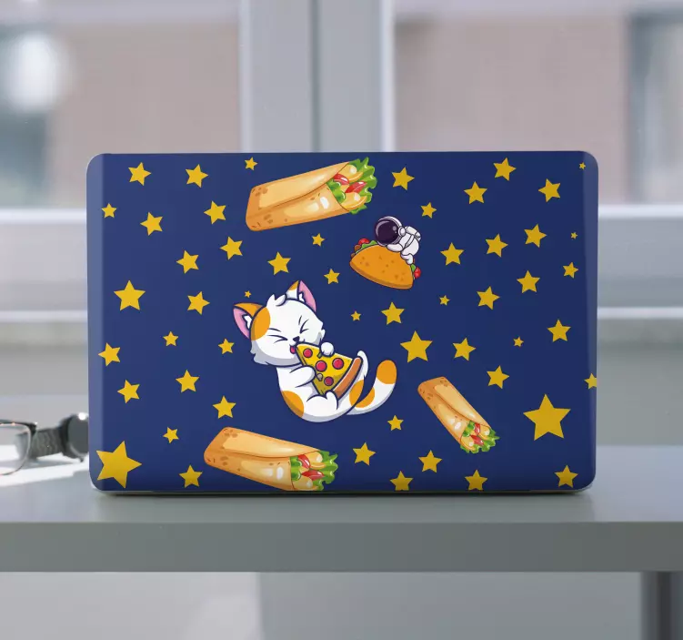Ces stickers pour ordinateur portable sont parfaits pour donner une touche d'originalité à votre ordinateur portable. Le fond bleu est orné d'un chat entouré de burritos, de pizzas et d'étoiles jaunes, créant un design amusant et unique.