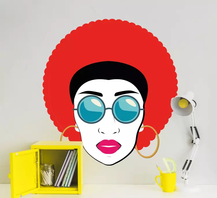 Découvrez notre Sticker personnes et personnages portrait afro audacieux qui capture l'essence d'une femme afro avec une illustration vibrante. Ce portrait coloré met en avant des lunettes de soleil et des accessoires féminins, créant une atmosphère à la fois audacieuse et joyeuse dans n'importe quel espace.