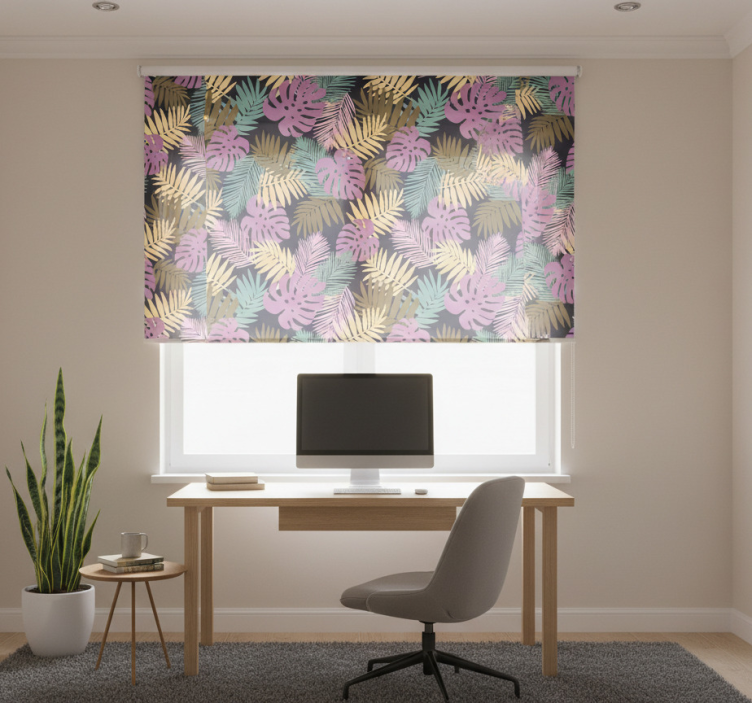 Store enrouleur bureaux feuilles vertes et roses tropiques