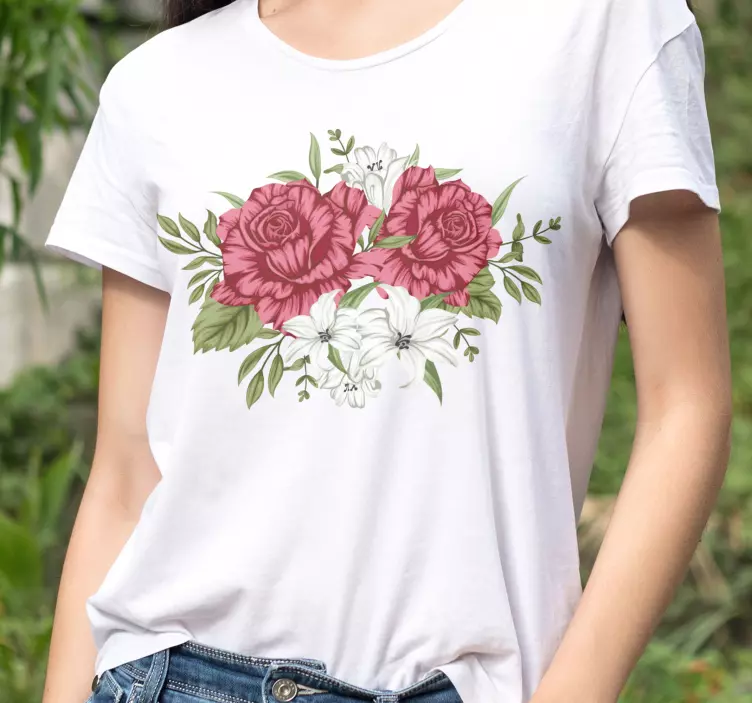 Référence: T4320Ce design présente des roses et des lys en fleurs, symbolisant la beauté et l'élégance. Les couleurs vives se démarquent, créant un attrait visuel saisissant. Parfait pour un look décontracté, il met en avant un mélange harmonieux d'éléments floraux, en faisant un choix idéal pour quiconque souhaite transmettre une ambiance fraîche et positive.