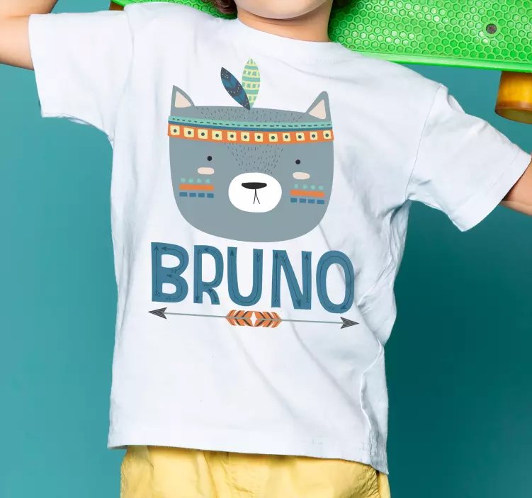 Référence: T4968Ce design présente un adorable visage d'ours avec des éléments tribaux, mis en valeur par des couleurs vives et un nom personnalisé. Il dégage une ambiance joyeuse parfaite pour les enfants. La composition est engageante et visuellement attrayante, ce qui en fait un choix idéal pour les jeunes.