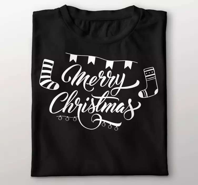Référence: T4656Ce design saisissant présente la phrase 'Merry Christmas' dans une typographie élégante, accompagnée de motifs festifs tels que des chaussettes et des éléments décoratifs, incarnant l'esprit de célébration pendant la saison des fêtes.