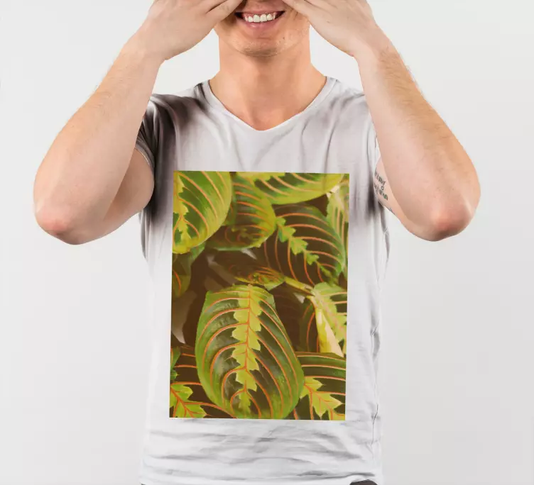 Découvrez notre T-shirt motif feuilles vertes, une véritable ode à la nature ! Ce design vibrant et frais présente des illustrations de marante et de feuilles tropicales, évoquant une jungle botanique. Les teintes de vert exotique apportent une texture unique, faisant de ce vêtement un incontournable pour ceux qui aiment la nature.