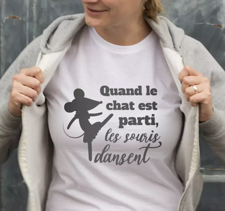 100% original, ce tee-shirt texte expression célèbre souris est parfait pour ceux et celles qui aiment transgresser les règles en secret ! Son motif indique en différentes calligraphies le fameux proverbe "Quand le chat est parti, les souris dansent", illustré d'une amusante souris en tutu en train de danser. Un article en coton agréable à porter dont l'impression est de qualité supérieure et de haute résolution. Nous recommandons de le laver et repasser à l'envers pour en profiter le plus longtemps possible. Sélectionnez la couleur du texte et la taille de votre choix pour passer votre commande en ligne. Vous recevrez dans les plus brefs délais votre tee-shirt texte proverbe quand le chat est parti !