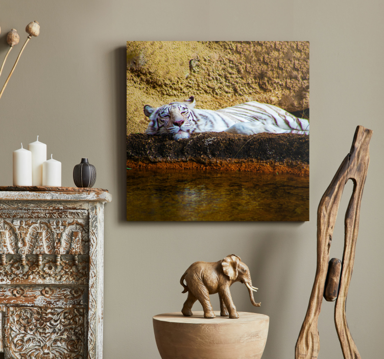 Référence: Q6655Un moment serein est capturé avec un tigre blanc se prélassant près de l'eau, montrant son comportement calme. Le tigre repose contre un fond texturé, mettant en valeur ses rayures distinctives et son expression paisible, entouré d'éléments naturels qui enrichissent la scène.