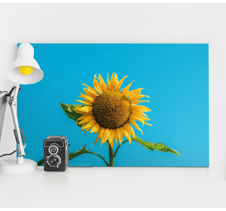 Référence: Q6665Un tournesol vibrant se dresse fièrement contre un fond bleu éclatant. Ses pétales dorés s'étendent vers l'extérieur, entourant un disque central texturé. De fraîches feuilles vertes s'étendent du tige, rehaussant la beauté naturelle de cette composition florale saisissante, parfaite pour apporter une touche joyeuse à tout espace.