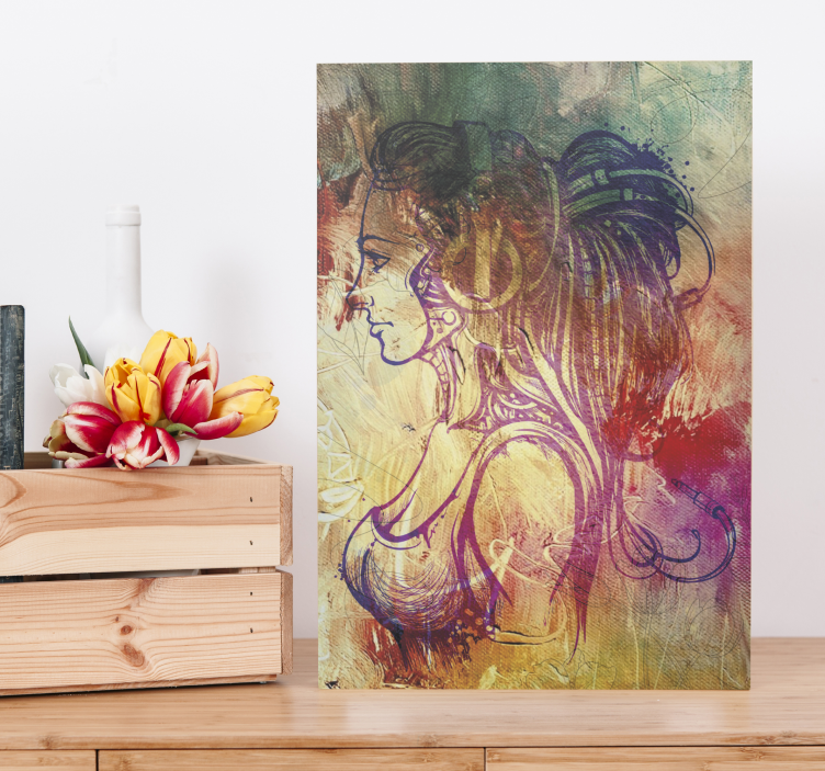 Référence: Q6417Une silhouette de profil captivante d'une femme aux cheveux flottants, illustrée de manière complexe sur un fond texturé. Le design capture l'essence de la féminité tout en mettant en valeur un travail de ligne détaillé et des éclats de couleur vibrants, créant un mélange harmonieux d'art et d'expression.